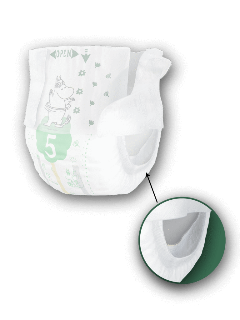 Vaippamme on suunniteltu alusta alkaen hellimään lapsesi ihoa. Moomin Baby vaipat eivät sisällä voiteita, hajusteita tai väriaineita – vain tarkoin valittuja, puhtaita materiaaleja. Imukerros on valmistettu uusiutuvasta, FCS®-sertifioidusta selluloosasta, joka valkaistaan ilman klooria. Kaikki käyttämämme raaka-aineet täyttävät tiukat Joutsenmerkin kriteerit. Turvallisuutta ja hellävaraisuutta, johon voit luottaa.