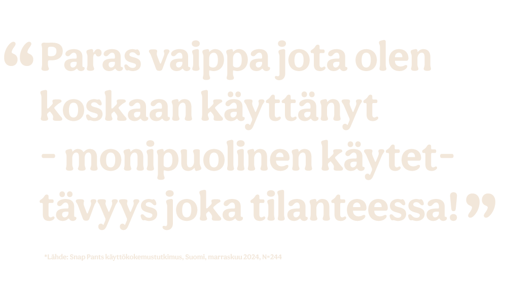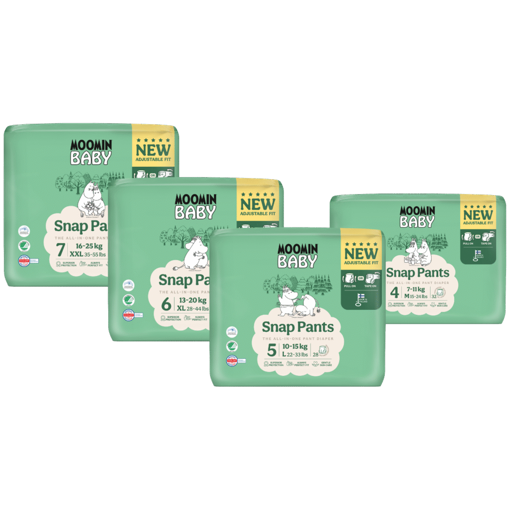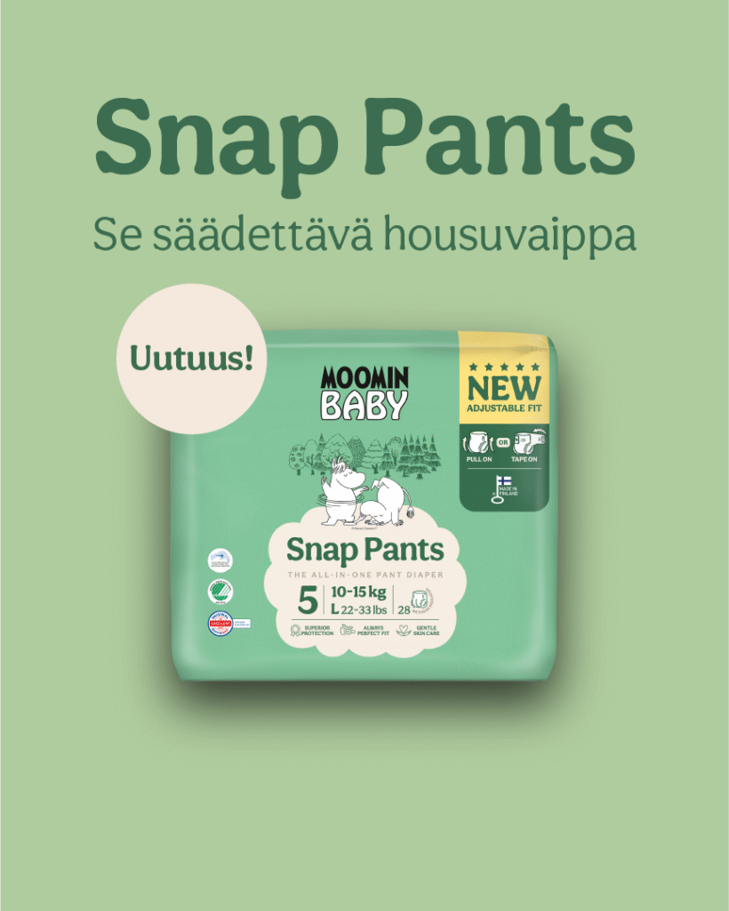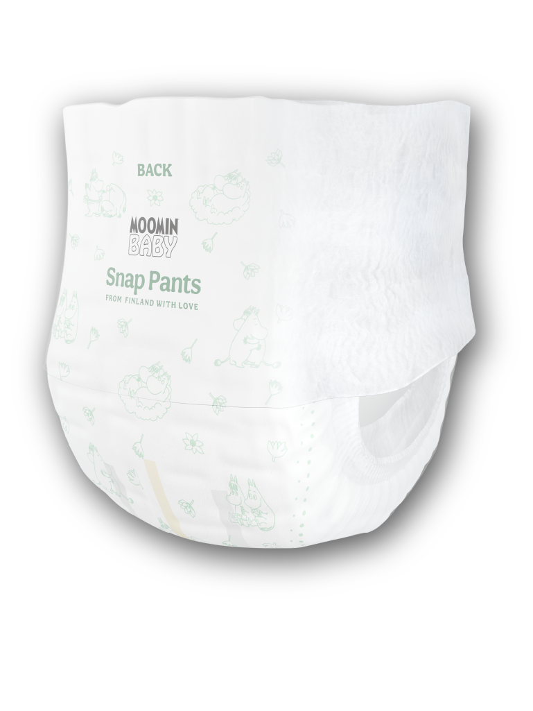 Moomin Baby Snap Pants -housuvaipan ainutlaatuinen ominaisuus; uudelleen avattavuus ja suljettavuus tuo ennen näkemätöntä joustavuutta ja vaivattomuutta vaippa-arkeen. Snap Pants -housuvaipan voi pukea kuin perinteisen housuvaipan tai tarpeen vaatiessa kuin teippivaipan – aina tilanteen mukaan! Milloin vain, missä vain, miten vain – snäppärää, eikö totta?