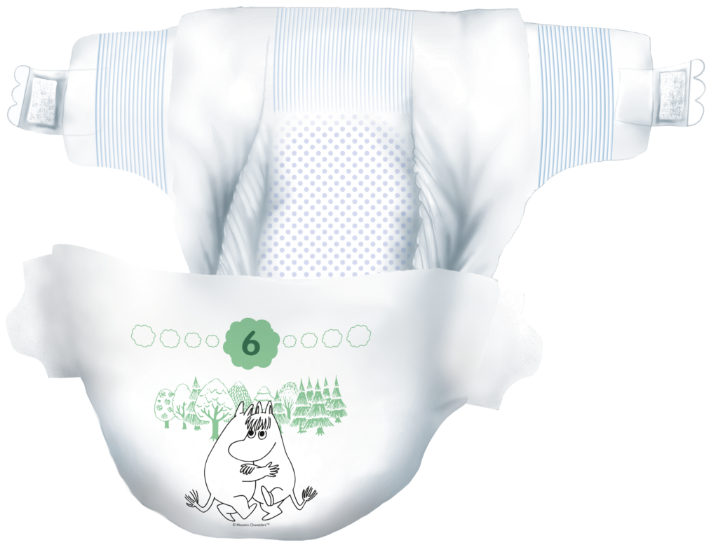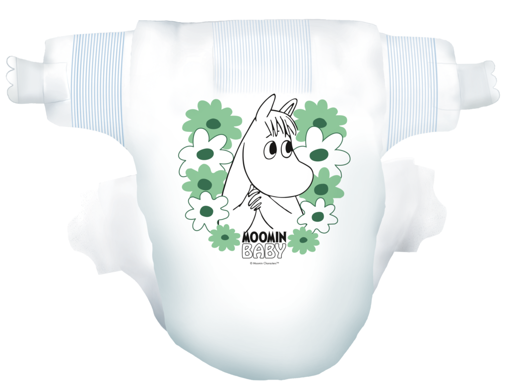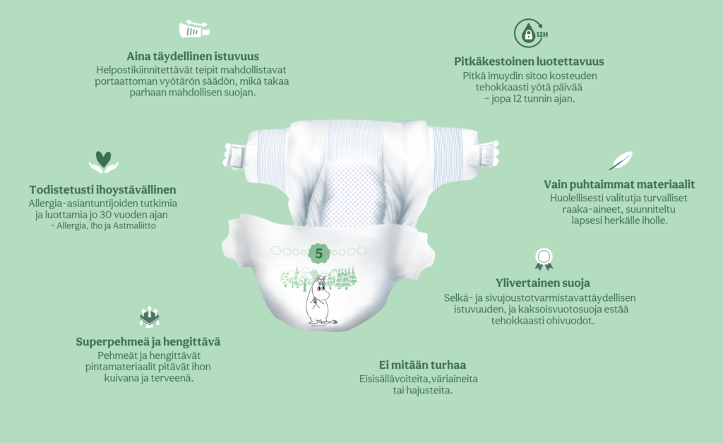 Moomin Baby -vaipat ovat kaikin puolin huoleton ja turvallinen valinta lapsellesi, sillä kaikki niissä käytetyt raaka-aineet täyttävät Joutsenmerkin ja Allergia-, Iho- ja Astmaliiton asettamat tarkat kriteerit kemikaaleille. Moomin Baby -vaipat eivät koskaan sisällä tuoksuja, väriaineita tai voiteita, jotka voivat ärsyttää vauvan herkkää ihoa.