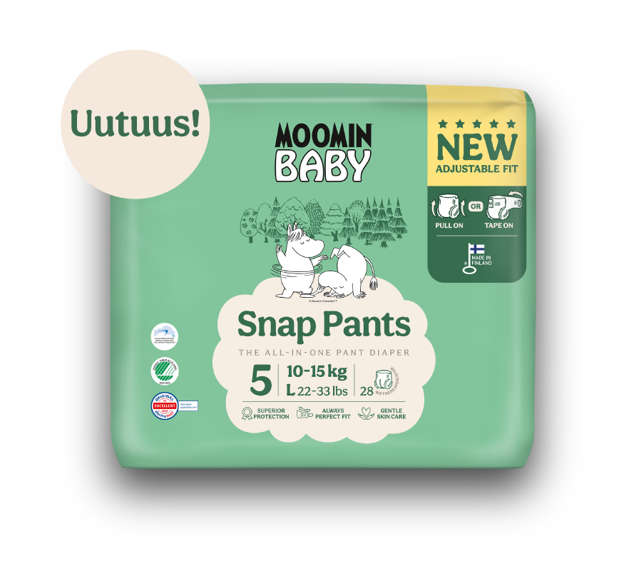 Moomin Baby -vaipat ovat kaikin puolin huoleton ja turvallinen valinta lapsellesi, sillä kaikki niissä käytetyt raaka-aineet täyttävät Joutsenmerkin ja Allergia-, Iho- ja Astmaliiton asettamat tarkat kriteerit kemikaaleille. Moomin Baby -vaipat eivät koskaan sisällä tuoksuja, väriaineita tai voiteita, jotka voivat ärsyttää vauvan herkkää ihoa.