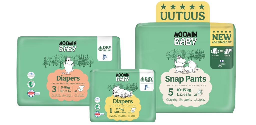 – Moomin Baby -vaipoissa selluloosa on peräisin FSC-sertifioiduista metsistä ja valkaistu täysin kloorittomasti hapella. Raaka-aineiden valinnassa tarkastelemme sekä turvallisuutta että sitä, miten materiaalit toimivat yhdessä vaipan rakenteessa.